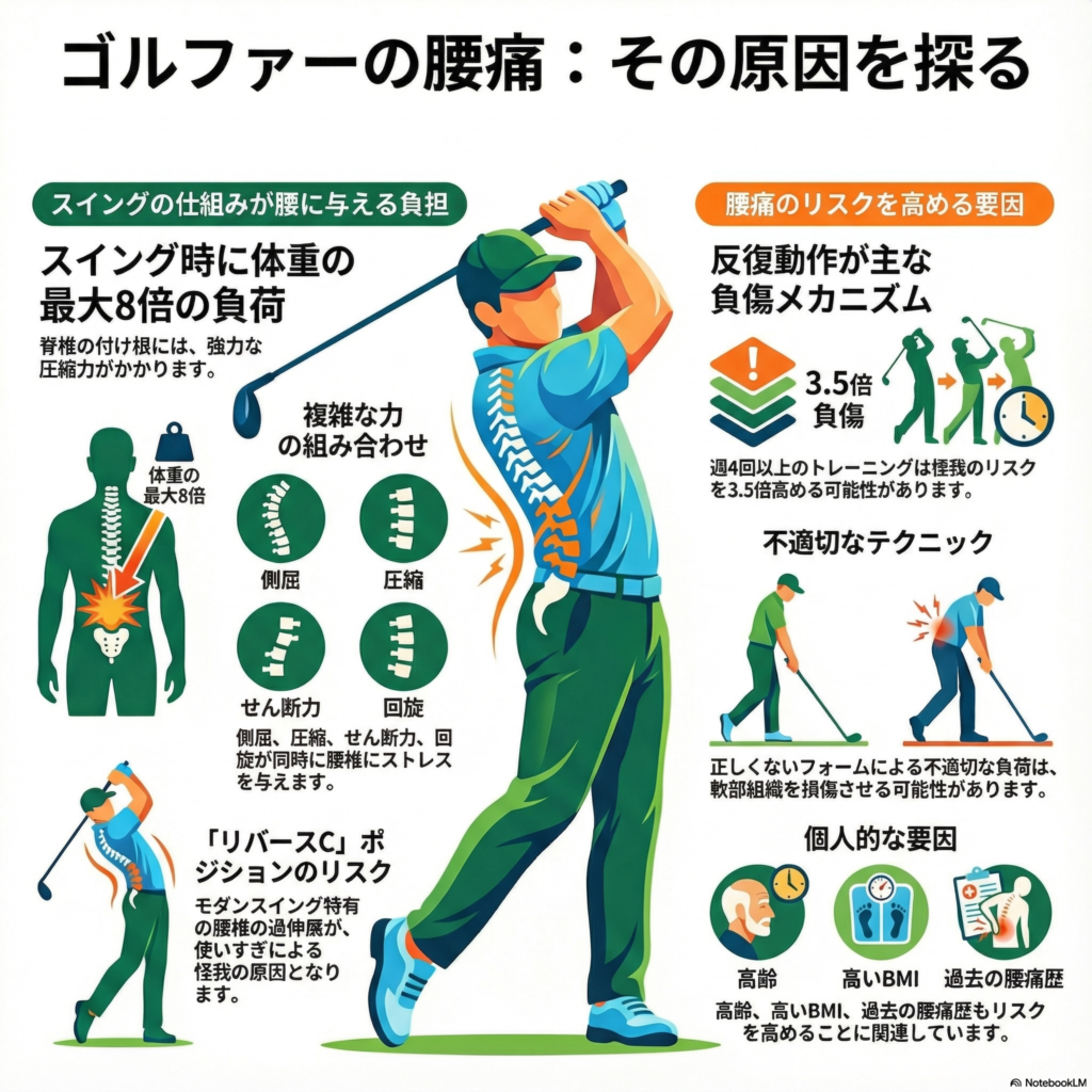 - 非対称な動き: ゴルフ特有の非対称な動作は、筋肉の不均衡を招きやすく、腰痛のリスクを高めます。